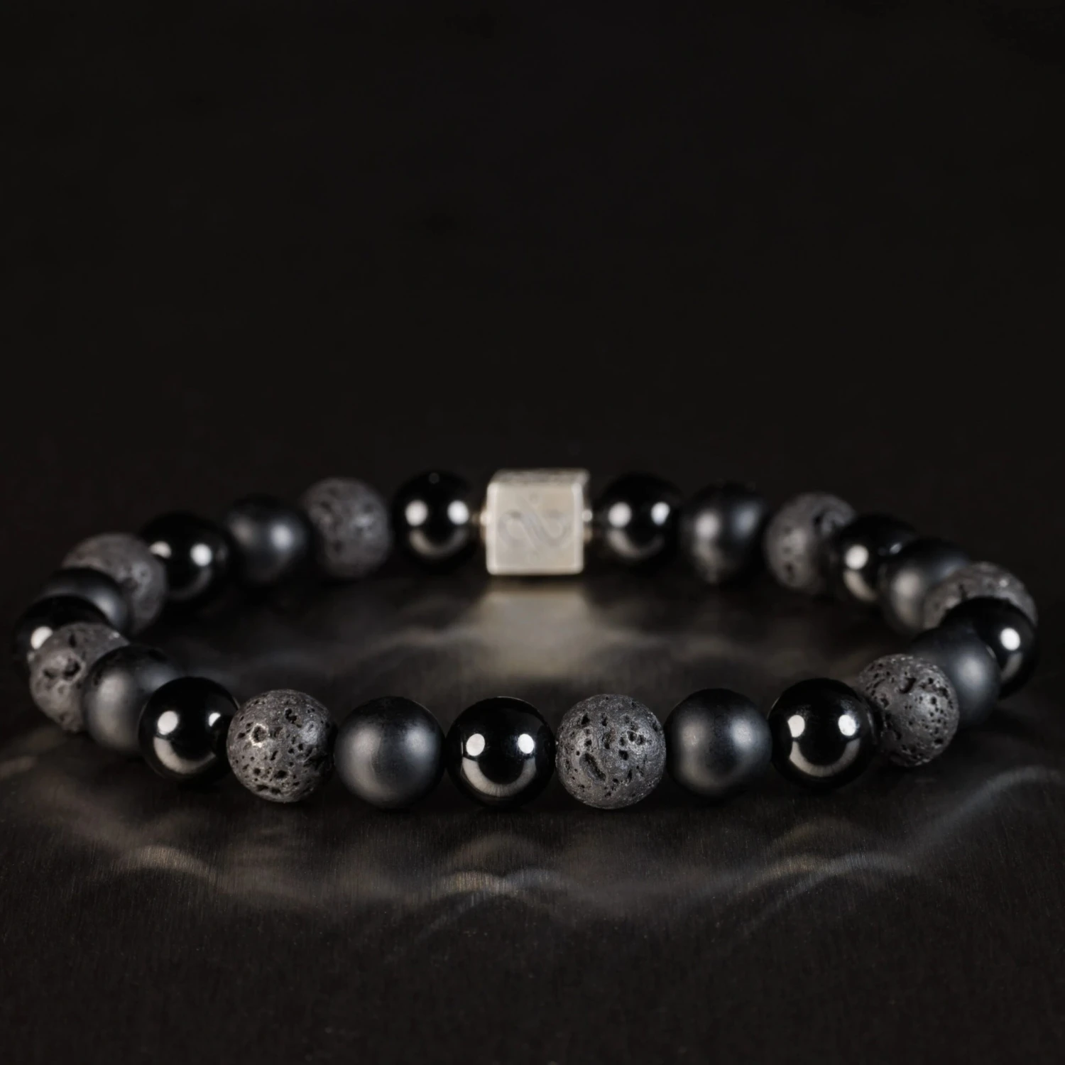Lava, Black Tourmaline and Matte Obsidian beads with a size of 8 millimetres, combined with one 925 Sterling Silver logo bead. Comes with a linen pouch.