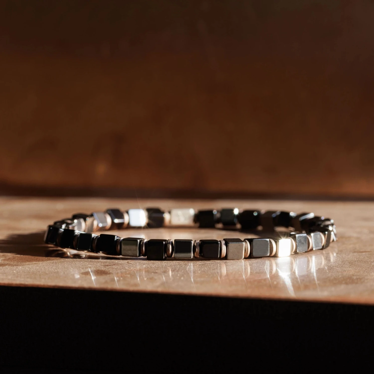 Complete your outfit with our Black Onyx – Hematite Cube bracelet II (4mm). Handcrafted in The Netherlands by professional artisans with the best Nature has to offer and finished with 925 Sterling Silver.