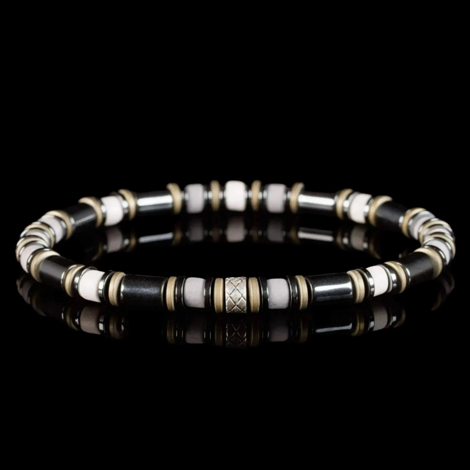 Complete your outfit with our Hematite – Grey/White Bracelet I (6mm). Handcrafted in The Netherlands by professional artisans with the best Nature has to offer and finished with 925 Sterling Silver.