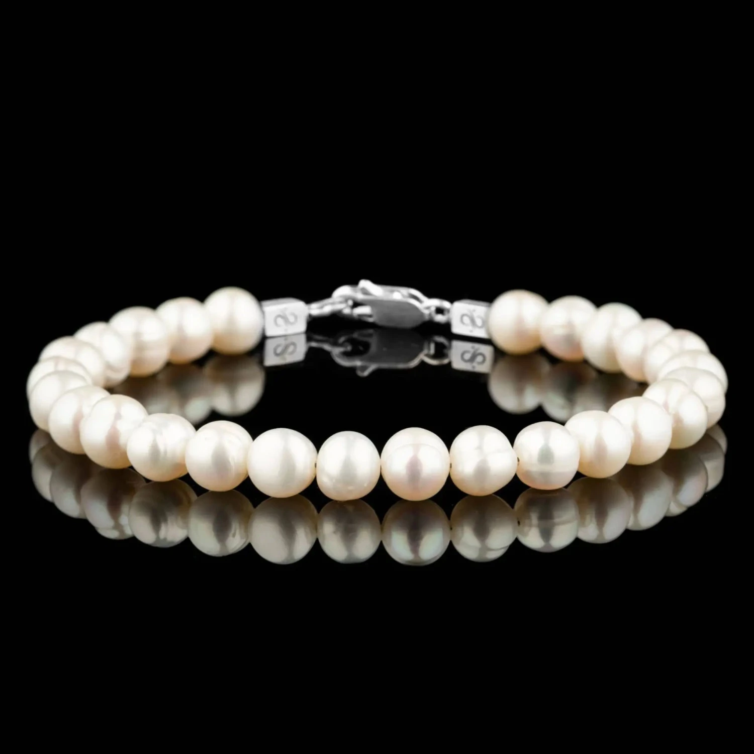 Less is More. This bracelet is composed solely of natural white pearls and adapts fluidly to any outfit. Unlike mined gemstones, pearls are a unique organic creation, each one a testament to the wonders of nature.