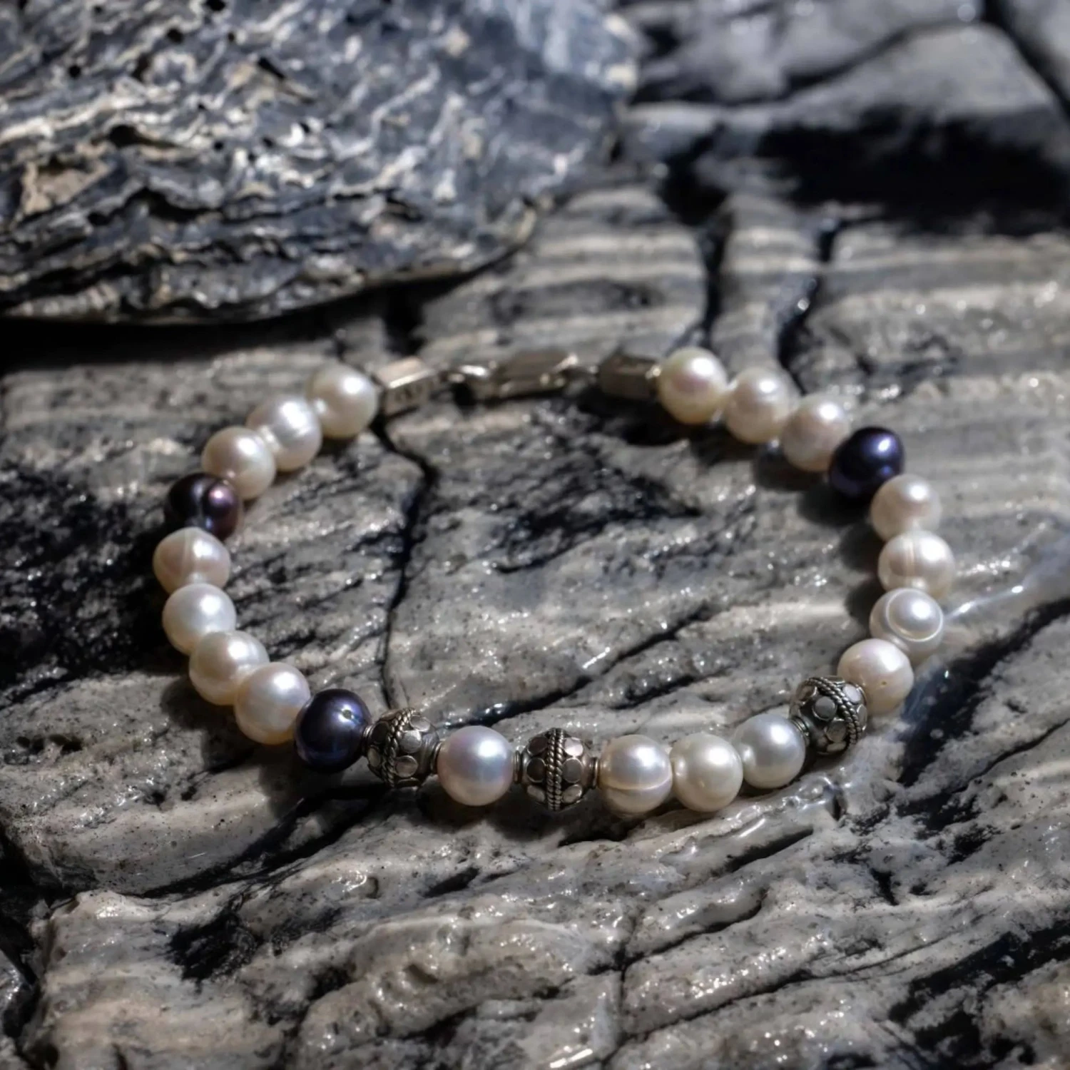 The addition of blue pearls and silver beads make this bracelet of natural white pearls both bold and chic at the same time. Unlike mined gemstones, pearls are a unique organic creation, each one a testament to the wonders of nature.