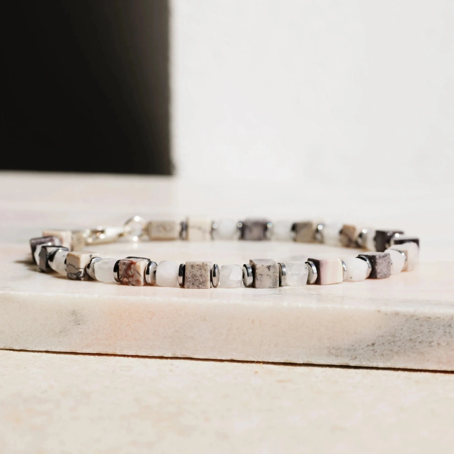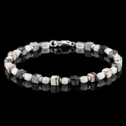 Complete your outfit with our Porcelain Jasper – White Moonstone Cube Bracelet I (4-4.5mm). Handcrafted in The Netherlands by professional artisans with the best Nature has to offer and finished with 925 Sterling Silver.